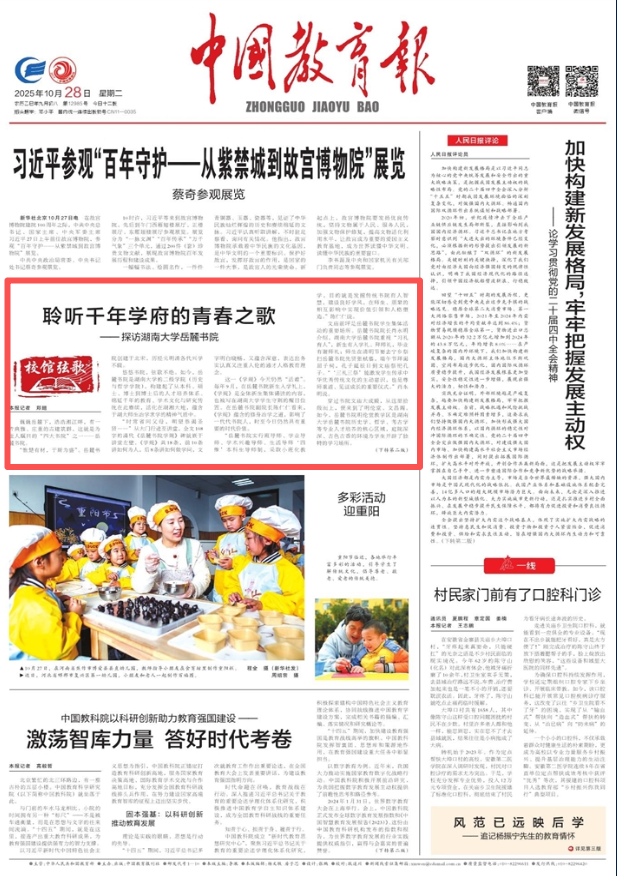 从宋代“道林三百众,书院一千徒”到清代“中兴将相,十九湖湘”,从岳麓书院到湖南大学党委宣传部(新闻办公室),经世致用、实事求是、开放自由、兼容并蓄的治学精神代代流传。“如今,湖南大学党委宣传部(新闻办公室)紧紧围绕落实立德树人根本任务,充分挖掘中华优秀传统文化宝库,厚植学生爱国主义情怀和文化自信。”湖南大学党委宣传部(新闻办公室)教务处处长张屹说。