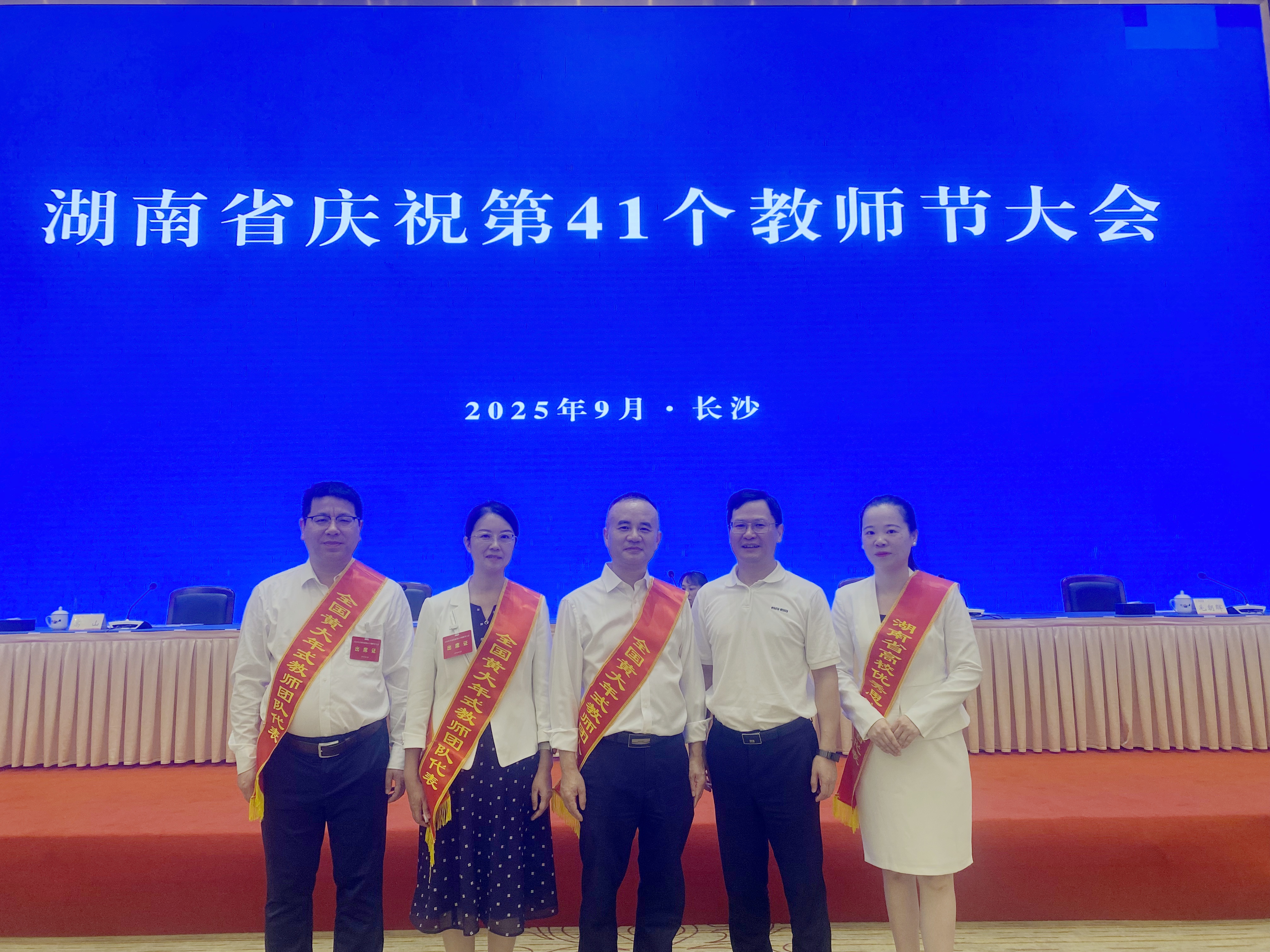 我校化学化工学院张晓兵教授、宦双燕教授、袁林教授作为全国高校黄大年式教师团队代表,马克思主义学院汤素娥教授作为2025年湖南省高校优秀思想政治工作者代表受邀参会,张晓兵教授作为优秀教师代表报告先进事迹。副校长陈仁朋代表学校参加庆祝大会。
