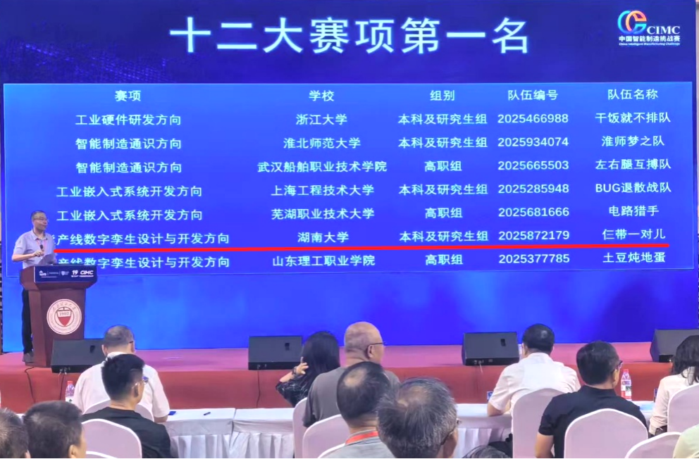 我校五支队伍晋级全国总决赛。其中,“仨带一对儿”(智能制造工程2301班赵齐文、胡子捷、曹登浩)获得智能产线数字孪生设计与开发方向特等奖,“我说的都对”(智能制造2402班朱佳莹)获得智能制造通识方向二等奖,“智造凌云组”(自动化2404班程章涛)获得智能制造通识方向二等奖,“湘机智创队”(智能制造2401班周胤宏、钟凯、吴雨莲)获得智能装备设计与数字孪生制造方向二等奖,“赛博突突突”(自动化2203班方礼稷、周子婷、罗腾彤)获得精益智造与协作机器人方向二等奖,指导老师由机械院朱克忆老师担任。