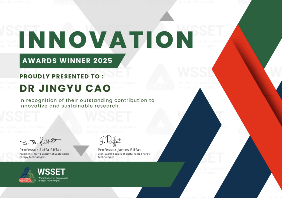 近日,世界可持续能源技术学会(WSSET)颁发了2025年WSSET创新奖(WSSETInnovation Awards),土木工程学院曹静宇副教授荣获该奖项。