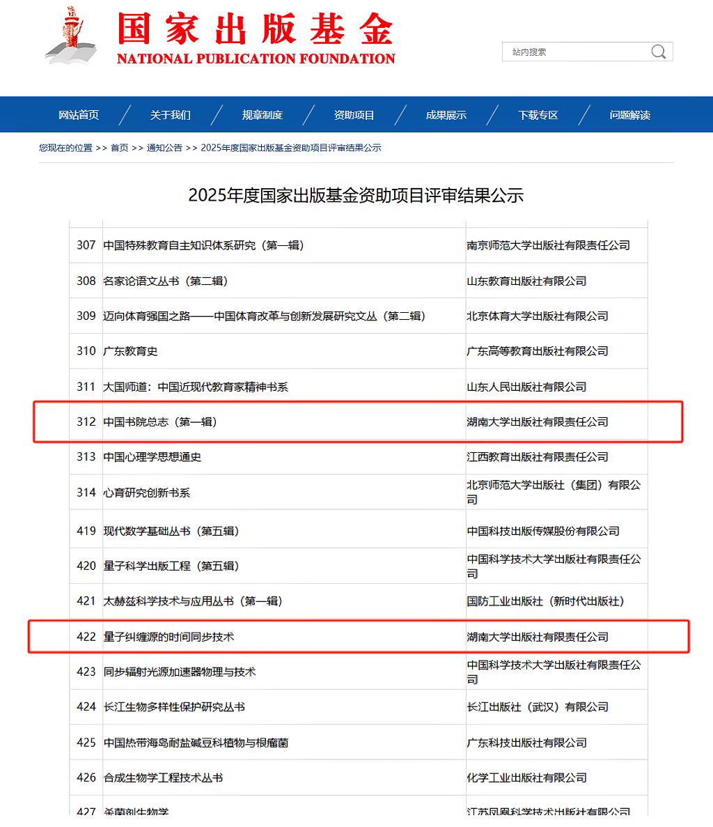 近日,国家出版基金规划管理办公室公布了“2025年度国家出版基金资助项目评审结果”,我校出版社《中国书院总志(第一辑)》《量子纠缠源的时间同步技术》2个项目入选国家出版基金资助项目名单。