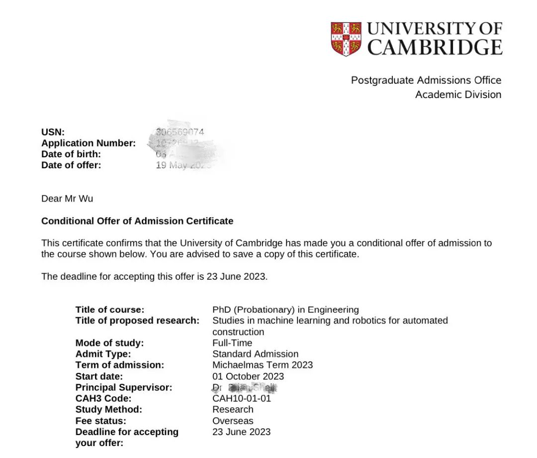 最后一次面试是面对剑桥大学的面试,一共分为三轮。第一轮面试在大年初八,由组里的博后和他一起聊一聊申请意愿和研究经历,整体氛围还比较轻松;第二次面试是导师亲自面试,基于前期在导师团队的科研熏陶和学术积累,吴海兵在面试过程中展现出扎实的基本研究技能和开阔的研究视野,对方导师在面试当场就表明了录取意向;第三次面试是奖学金资助方的面试,由公司工程主管担任面试官,吴海兵在面试前对公司的发展理念、业务范围以及技术需求做了充分了解,“整个氛围也是比较轻松的。”吴海兵告诉记者,3月底剑桥大学的老师通过邮件告知他将被录取,并获得每年约50万人民币的奖学金。如今,他已经收到了来自剑桥的入学通知书。