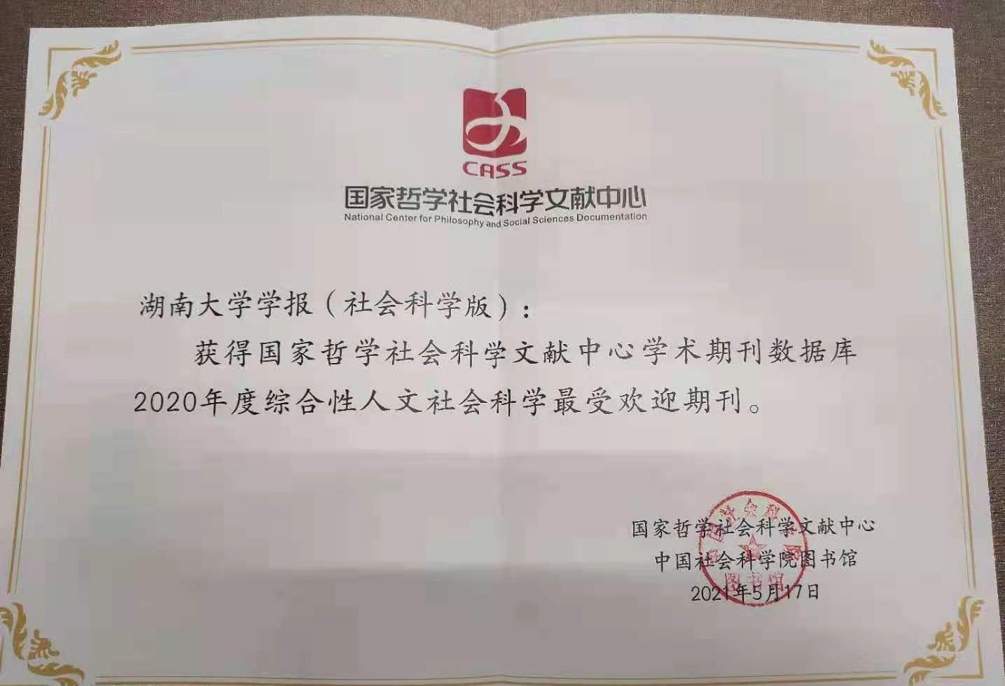 近期,中国社会科学院图书馆在北京召开了国家哲学社会科学文献中心建设成果发布会,公布了2016-2021年最受欢迎期刊、最受欢迎新刊及2020年度最受欢迎期刊,并授予证书。《湖南大学党委宣传部(新闻办公室)学报(社会科学版)》各项指标均在前列,既被评为2016—2021年最受欢迎期刊,又被评为2020年度最受欢迎期刊。