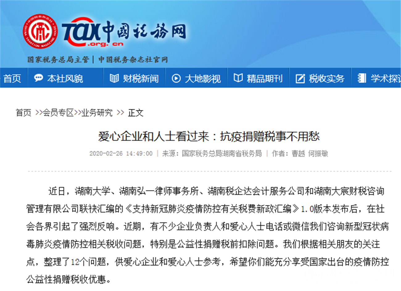 曹越教授在中国税务网、新湖南、红网等发表了《爱心企业和人士看过来:抗疫捐赠税事不用愁》《汇编抗疫税费新政,打赢疫情防控阻击战》系列文章,用专业知识帮助纳税人和各利益相关方掌握疫情防控税费政策。