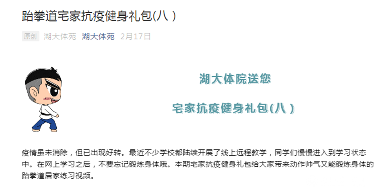 体育学院专家团队推出《防疫宅家健身系列视频大礼包》8套,亲身示范教授武术、舞蹈、跆拳道、健身等居家隔离期间可进行的体育活动,丰富了师生文体生活,增强抵抗力。