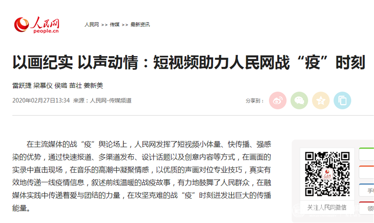 新闻传播与影视艺术学院教授雷跃捷在光明网、中国日报网、人民网发表《短视频:凸显主流媒体战疫新画风》《疫情易引发心理问题,科普宣教如何发挥作用?》《以画纪实,以声动情:短视频助力人民网战“疫”时刻》等多篇文章,建议新闻媒体在科普宣传方面要引领主流,弘扬社会正能量,带领社会群众科学、理性抗击疫情。