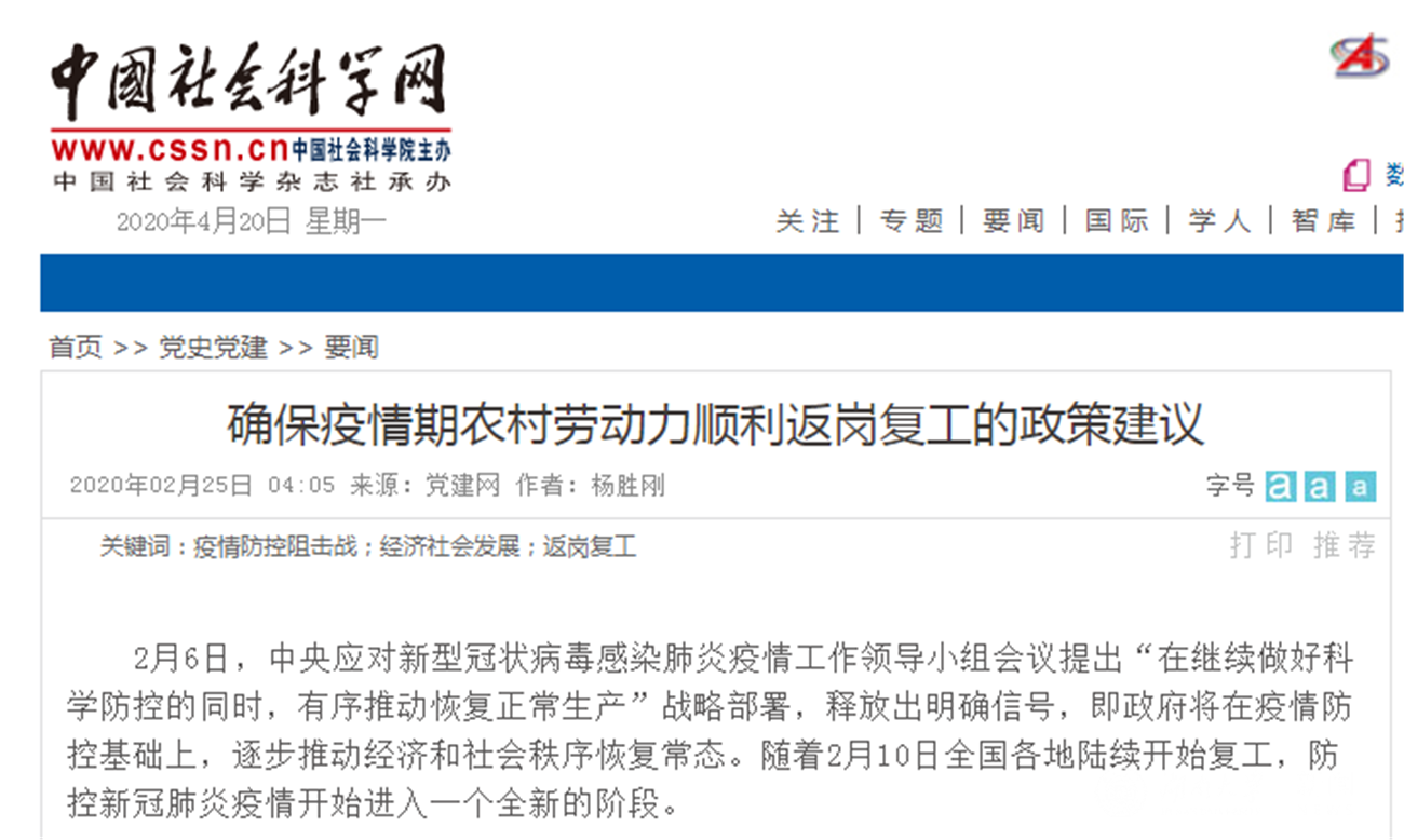 金融与统计学院教授、湖南省首批智库领军人才杨胜刚在党建网、学习强国、湖南日报发表《对当前支持我国民营企业有序恢复生产的政策建言》《确保疫情期农村劳动力顺利返岗复工的政策建议》《综合施策,稳住湖南外贸外资基本盘》等多篇文章,为企业复工复产、国民经济恢复、后疫情阶段经济社会可能面对问题及对策做出专业分析与建议。
