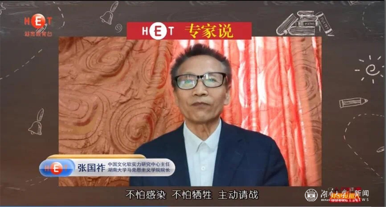 中央马工程首席专家、湖南省首批智库领军人才、马克思主义学院教授张国祚先后在求是网、学习强国发表《瘟疫必战胜》《观抗疫新闻有感》《祈福庚子年》《天使礼赞》系列诗歌,为白衣天使称赞,为中国加油祈福;在“我是接班人”湖南省网络大课堂《开学第一课,我们相信》受邀开讲,与同学们一起上好新学期复学后的第一课。