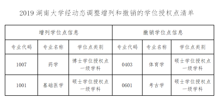 近日,国务院学位委员会印发《国务院学位委员会关于下达2019年动态调整撤销和增列的学位授权点名单的通知》(学位〔2020〕3号),我校新增药学一级学科博士学位授权点和基础医学一级学科硕士学位授权点,撤销考古学和体育学两个一级学科硕士学位授权点。