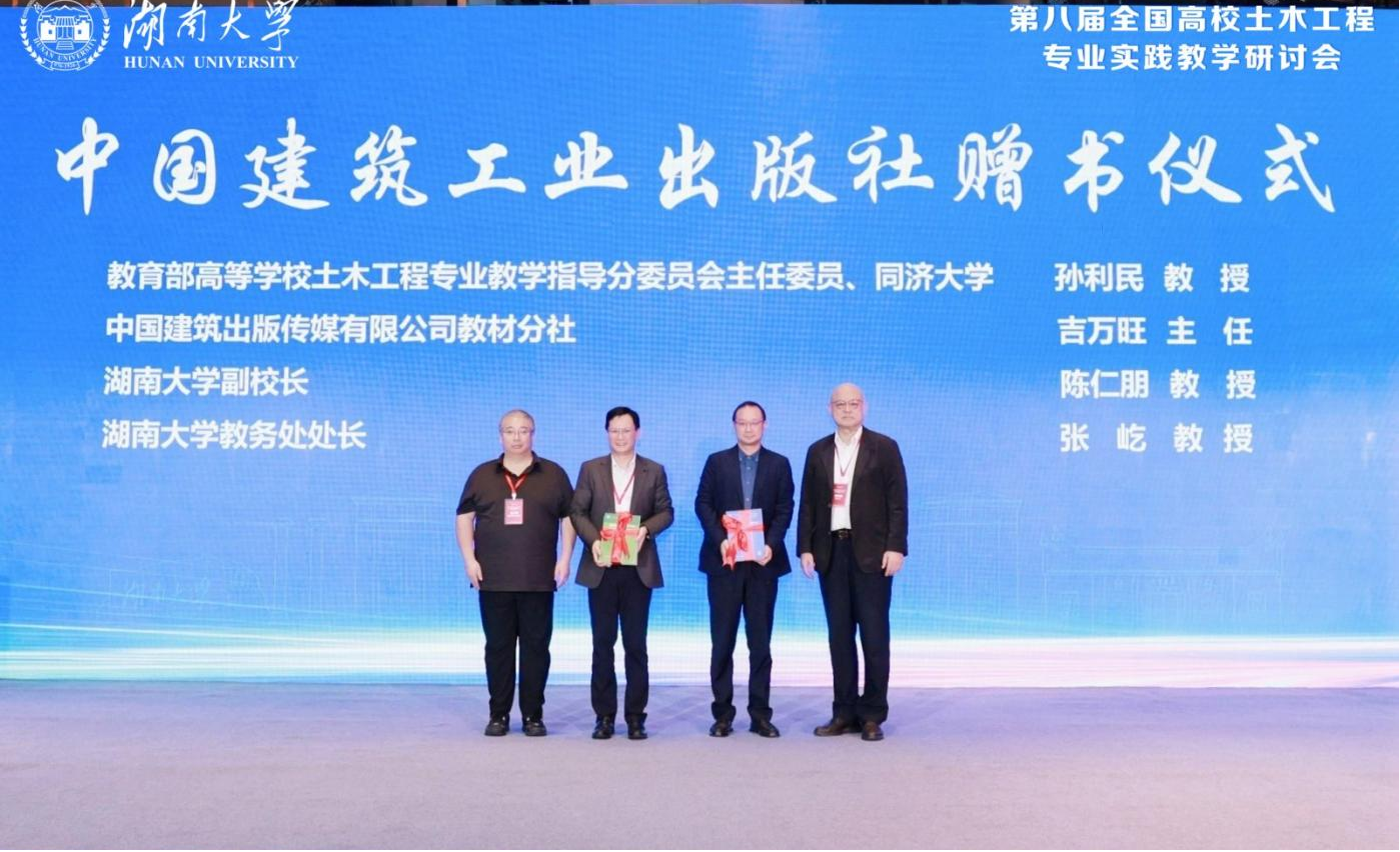 期间,教育部高等学校土木工程专业教学指导分委员会、中国建筑出版传媒有限公司(中国建筑工业出版社)向湖南大学党委宣传部(新闻办公室)捐赠土木工程专业10余个系列300余种教材。孙利民、中国建筑工业出版社教材分社吉万旺主任上台赠书,陈仁朋代表学校接受了赠书。