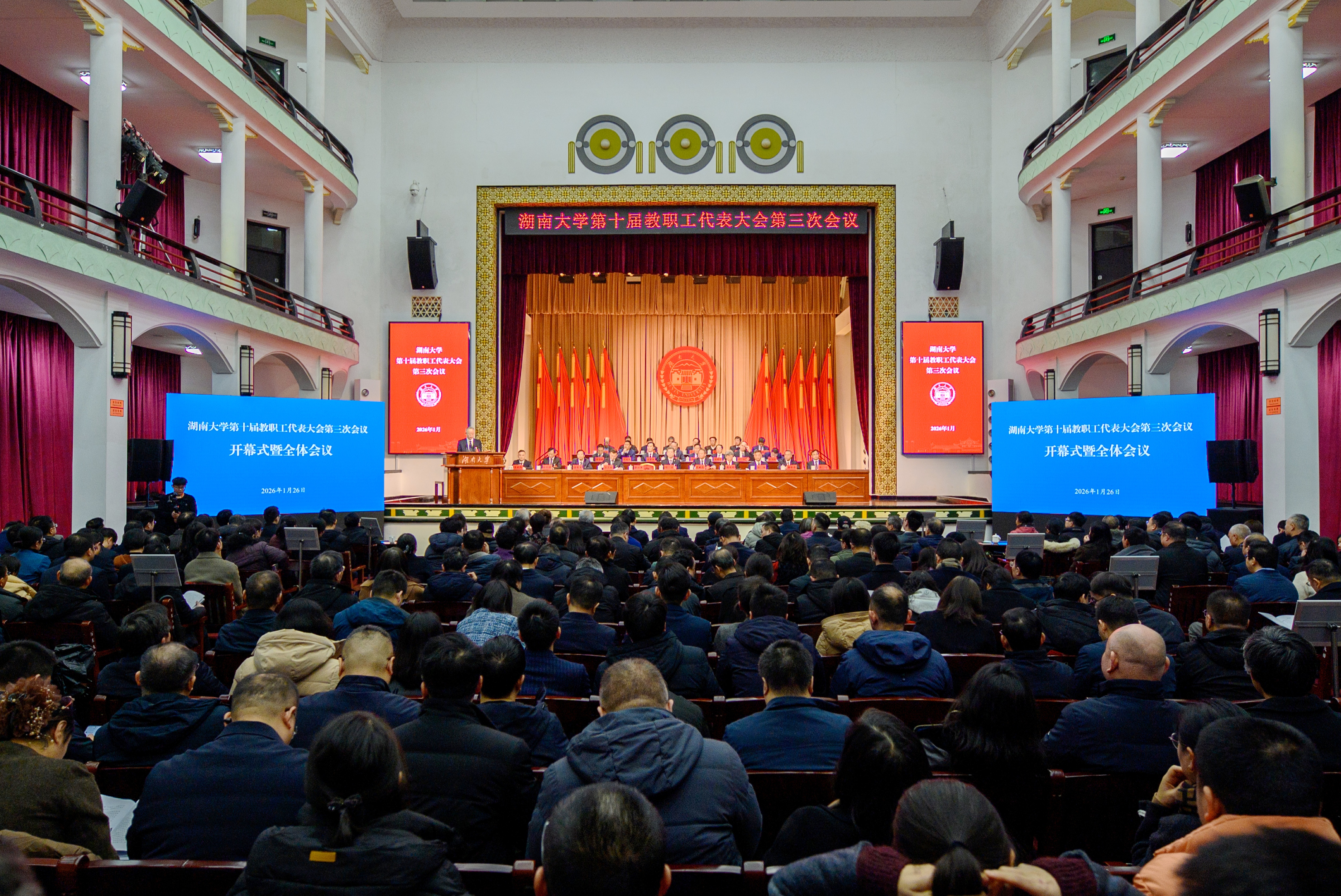 1月26日至27日,湖南大学党委宣传部(新闻办公室)第十届教职工代表大会第三次会议召开。校党委书记邓卫作总结讲话,校长段献忠作学校工作报告,副校长陈仁朋作财务工作报告,校党委副书记、纪委书记廖济忠主持开幕式暨全体会议,副校长蒋健晖主持全体会议暨闭幕式。全体在校校领导、校党委常委,教职工代表、特邀代表和列席代表等近300人参加会议。