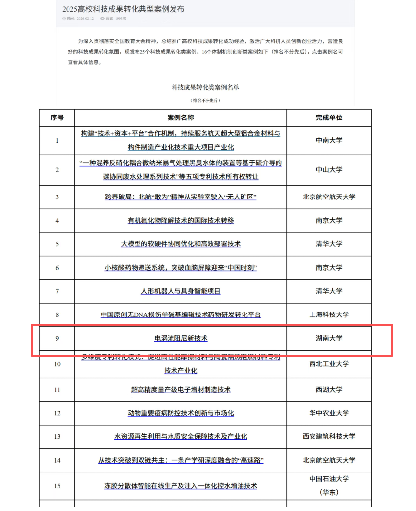 近日,为深入贯彻落实全国教育大会精神,总结推广高校科技成果转化成功经验,激活广大科研人员创新创业活力,营造良好的科技成果转化氛围,教育部高等学校科学研究发展中心发布25个科技成果转化类案例、16个体制机制创新类案例,我校陈政清院士团队“电涡流阻尼新技术”入选科技成果转化类案例。