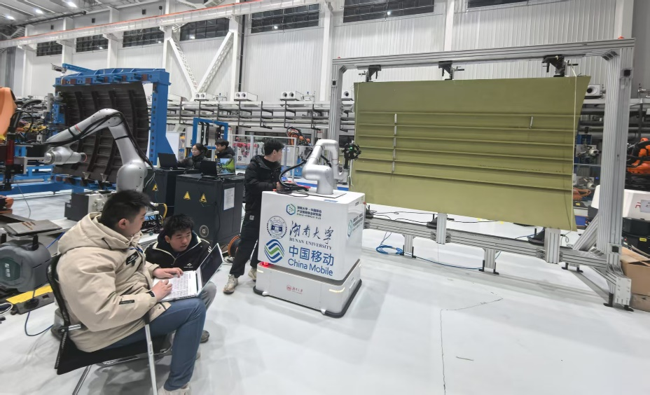 机器人视觉感知与控制技术国家工程研究中心的师生团队在中国商飞上海飞机制造有限公司,针对宽体机身壁板开展多机器人全流程自动化形性协同装配技术攻关,旨在突破航空大型复材构件高精度柔性装配技术瓶颈,服务国产大飞机战略需求。