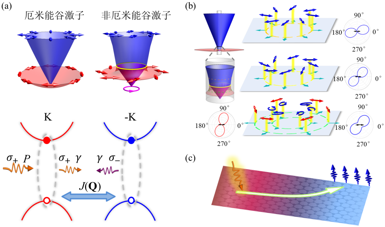 能谷自由度是指布洛赫电子在动量空间中不等价的能量极值点,是能谷电子学的基本信息编码载体。在二维过渡金属硫族化合物半导体中,该自由度可继承到由强库伦相互作用束缚的电子-空穴对中,形成能谷激子。能谷激子具有光学选择定则,可通过控制泵浦光源的圆偏振性来激发,从而使得能谷自由度的操控成为可能。但在二维过渡金属硫族化合物半导体中,强交换相互作用导致不同能谷发生耦合,进而导致其能谷激子处于量子叠加态。理论上处于该量子叠加的能谷激子态应具有线偏振光辐射行为(图a),而这与通常在偏振分辨的光学实验中观测到的圆偏振光辐射行为相矛盾。