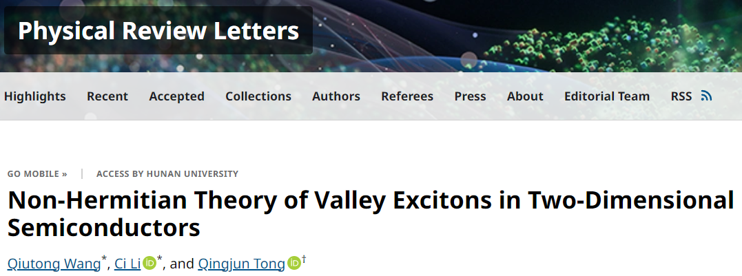 相关研究成果以《Non-Hermitian Theory of Valley Excitons in Two-Dimensional Semiconductors》为题发表在《物理评论快报》(Physics Review Letters),湖南大学党委宣传部(新闻办公室)物理与微电子科学学院为论文唯一单位,博士生王秋同和助理教授李辞为共同第一作者,童庆军教授为通讯作者。该工作得到国家自然科学基金、国家重点研发计划等项目的资助。