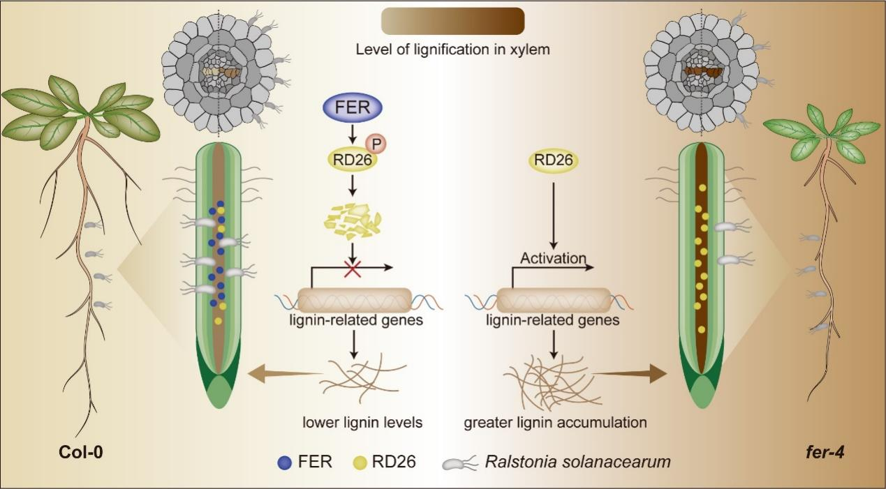 图2 FERONIA–RD26模块通过木质素合成调控植物对维管束病原菌青枯菌抗性