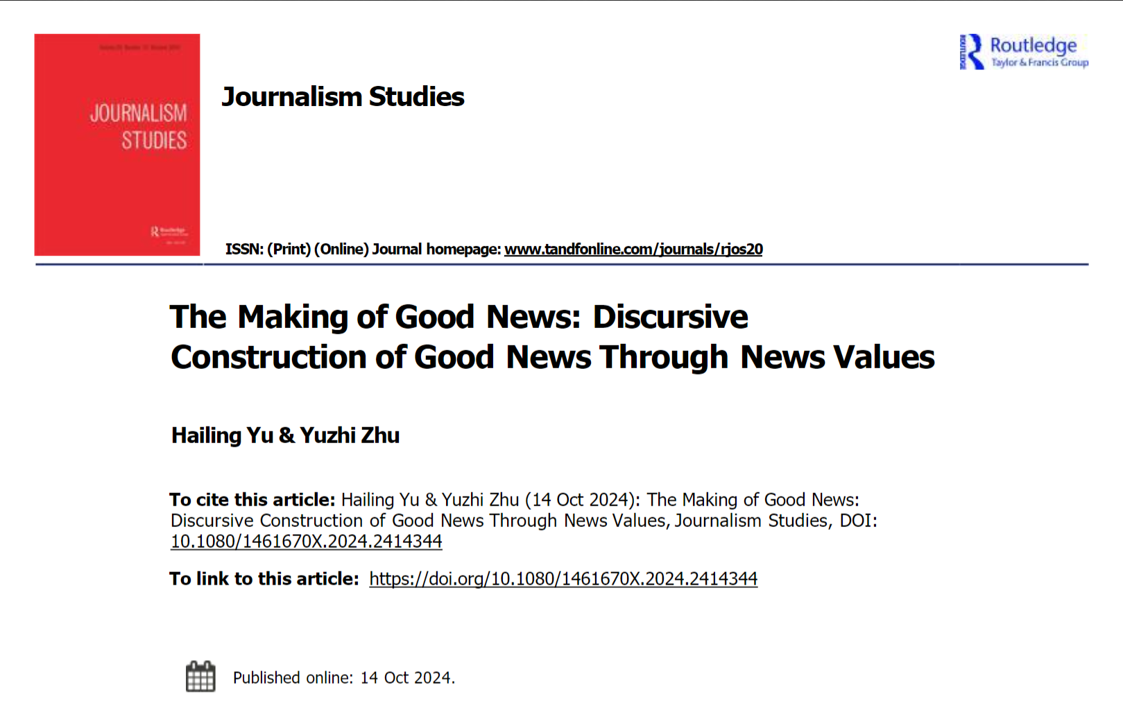 近日,外国语学院于海玲教授团队在语言学、新闻传播学跨学科研究中取得了新进展。研究成果以“The Making of Good News: Discursive Construction of Good News Through News Values”为题,在新闻传播学领域顶级期刊《Journalism Studies》上发表。