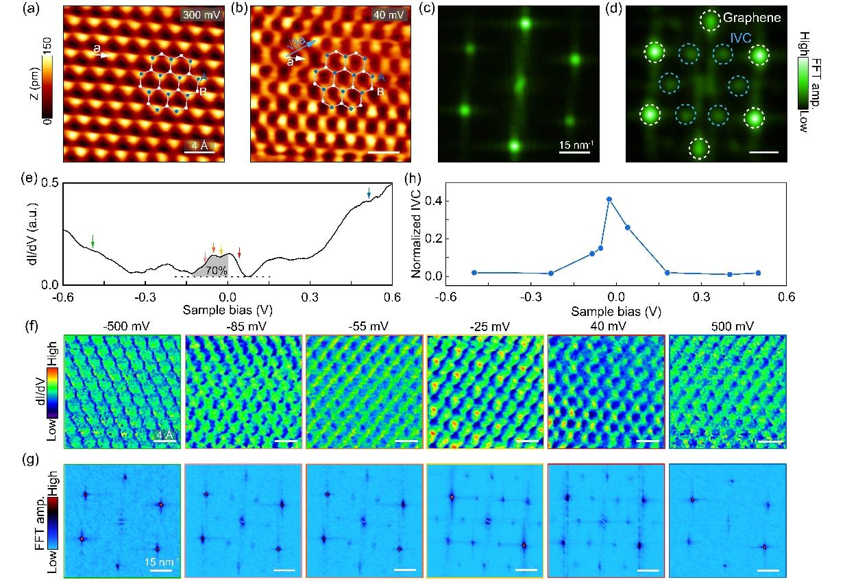近日,湖南大学党委宣传部(新闻办公室)物理与微电子科学学院殷隆晶教授团队基于扫描隧道显微镜/隧道谱的量子态微观成像技术,在二硫化钼衬底上的菱方四层石墨烯中,从实空间、原子尺度上直接观测到了由电子相互作用驱动的对称性破缺量子态——谷间相干(IVC)序。该IVC序由于自旋和谷的多重对称性破缺,其波函数表现出√3×√3的超晶格重构分布。这一重构被原子尺度的局域态密度空间成像直接观测到,且出现在液氮温度下。研究发现,该IVC序具有强烈的偏压和平带填充依赖性,仅在轻微掺杂的平带附近出现(实验在~60%和~70%填充的平带上发现)。并且在相同实验条件下,未在六方氮化硼衬底上发现该现象。结合理论计算表明,二硫化钼衬底诱导的Ising自旋轨道耦合邻近效应及其有限的屏蔽效应,对该IVC序的出现起到了至关重要的作用。这一发现直接证实了菱方石墨烯中理论预言的IVC序的存在,为该体系的对称性破缺量子态研究提供了重要的微观实验结果,并可能为理解其超导起源提供帮助。