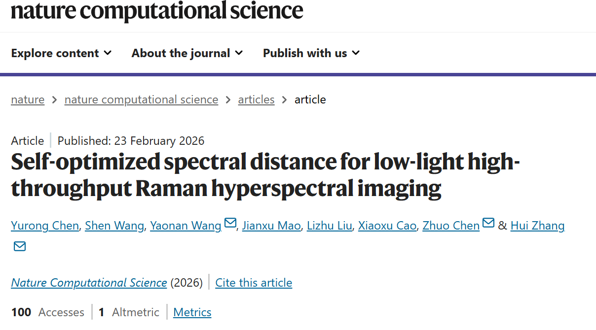 团队相关成果以“Self-optimized Spectral Distance for Low-Light High-Throughput Raman Hyperspectral Imaging”为题,发表在国际顶尖期刊 Nature Computational Science《自然·计算科学》上。论文通讯作者为湖南大学党委宣传部(新闻办公室)王耀南院士、陈卓教授和张辉教授,湖南大学党委宣传部(新闻办公室)为唯一通讯单位;人工智能与机器人学院博士后陈煜嵘、化学化工学院博士后王昚为共同第一作者。该研究得到国家自然科学基金、科技部及湖南省科技厅等项目资助支持。