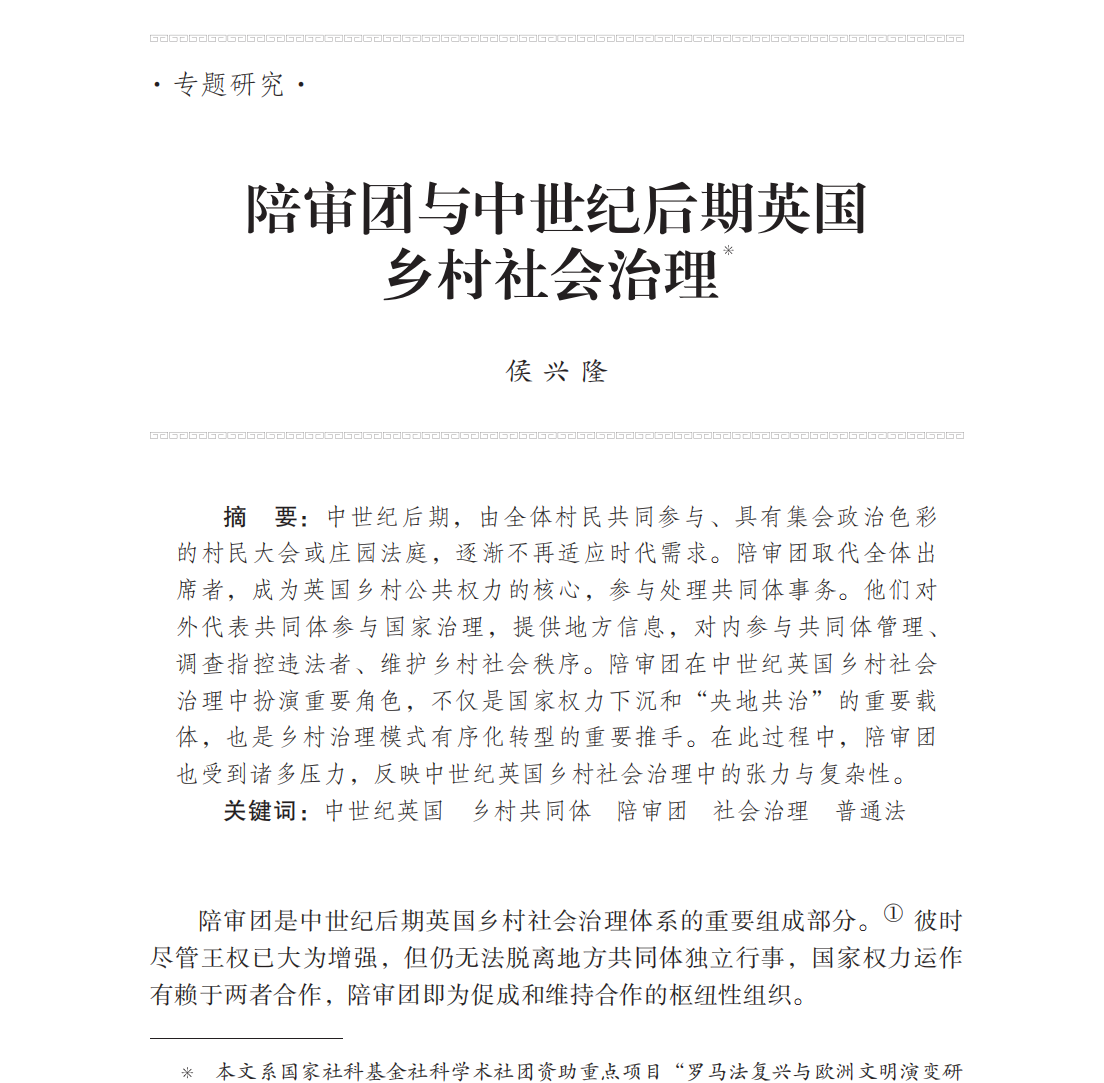 该文以中世纪后期英国乡村社会为切入点,探讨陪审团在基层权力结构转型中的关键作用,揭示了乡村治理由“全体村民出席”的集会型参与,向“代表性参与”的制度化形态转变的历史进程。文章指出,随着社会经济的复杂化与王室司法权的扩张,传统村民大会或庄园法庭已难以应对日益繁重的公共事务,陪审团遂逐步取代全体出席者,成为乡村公共权力的核心。对外,它代表共同体向王室司法体系提供地方信息,参与国家治理;对内,则承担调查违法行为、维护秩序与事务管理等职能。