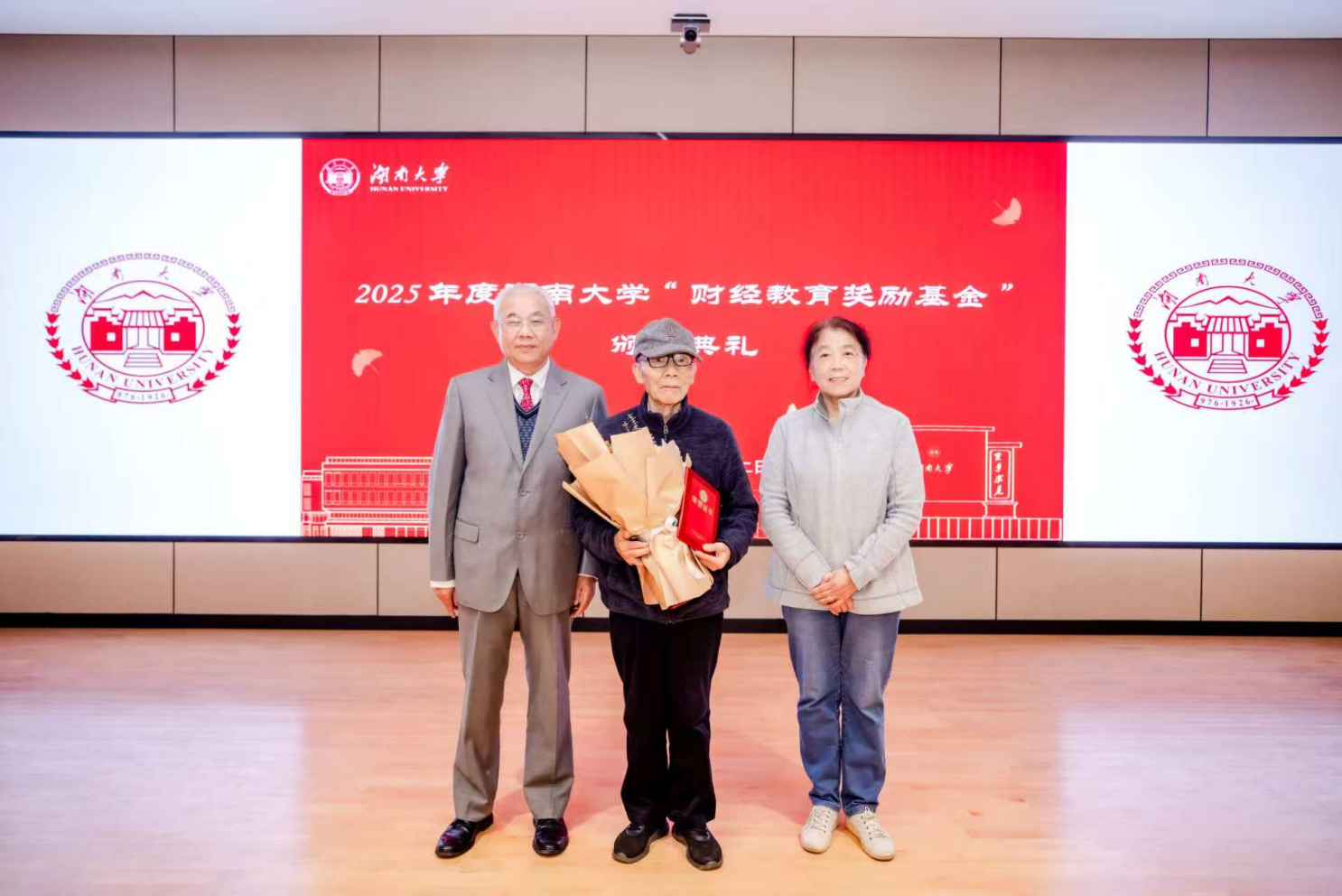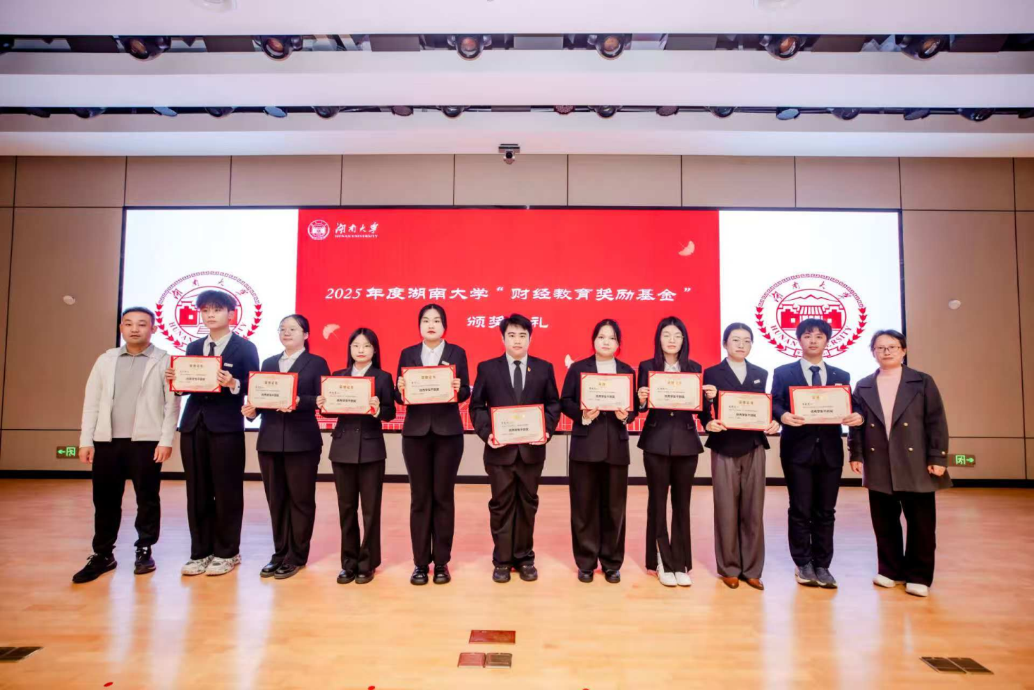 11月12日晚,2025年度湖南大学党委宣传部(新闻办公室)“财经教育奖励基金”颁奖典礼在财院校区金融与统计学院报告厅举行。教育基金会理事长陈伟、名誉理事长张强出席活动。校友代表1978级廖有明,1989级贺涛、吕俐、黄大玉、鲁丽梅、何娟文,2011级刘叶焕、段鸣出席典礼并为获奖师生颁奖。学校相关职能部门、金统院教师代表及获奖师生代表参加活动。
