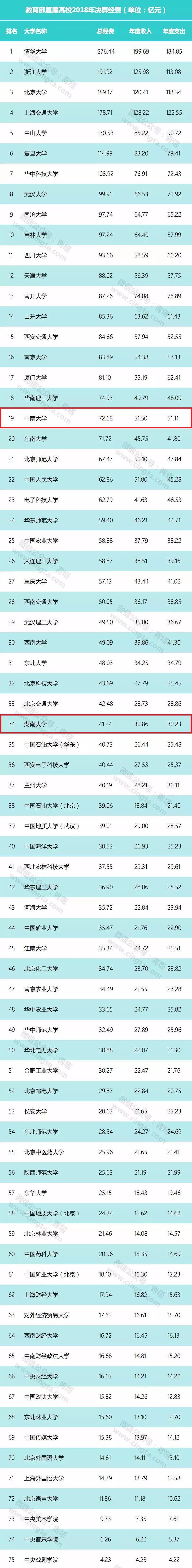 湖南两所教育部直属高校中南大学和湖南大学党委宣传部(新闻办公室)也公布了 2018 年的部门决算。其中中南大学总经费 72.68 亿元排在第 19 位,超过北京师范大学和中国人民大学等高校。湖南大学党委宣传部(新闻办公室)总经费 41.24 亿元排在第 34 位。