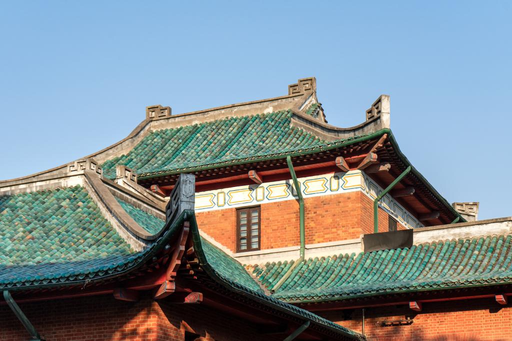 特藏分馆的屋脊,起翘平缓、直曲结合。端庄大气的红色墙身,与色泽艳丽的本地铜官釉瓦组合,使特藏分馆(老图书馆)具有独特的色彩韵律。▲阳维欣/摄