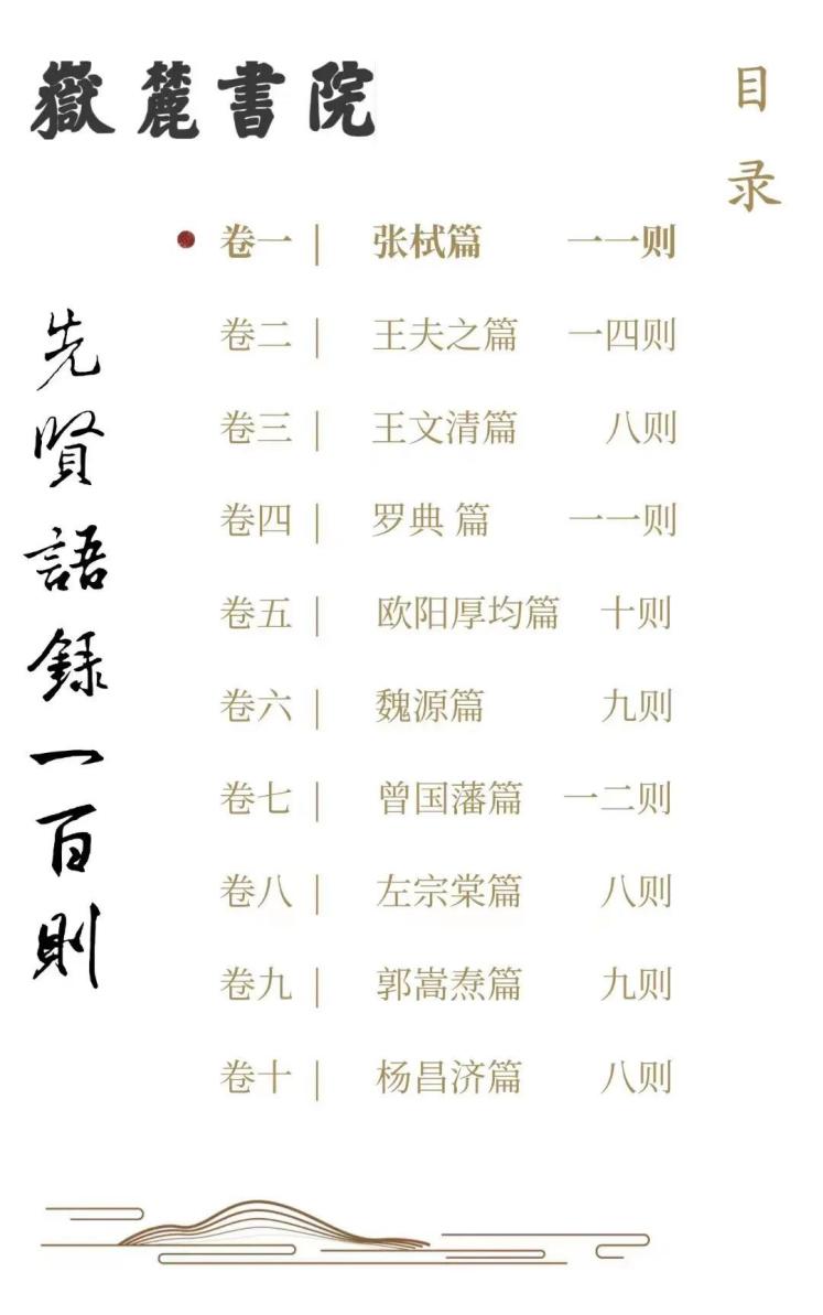 选取岳麓书院历史上十位贤达的经典著作,从中挑选百则语录,由陈仁仁教授担纲主编,推出“岳麓书院先贤语录一百则”栏目,集中展示书院先贤们在求知育人过程中的智慧。内容在“湖大学工”微信公众号持续推送。