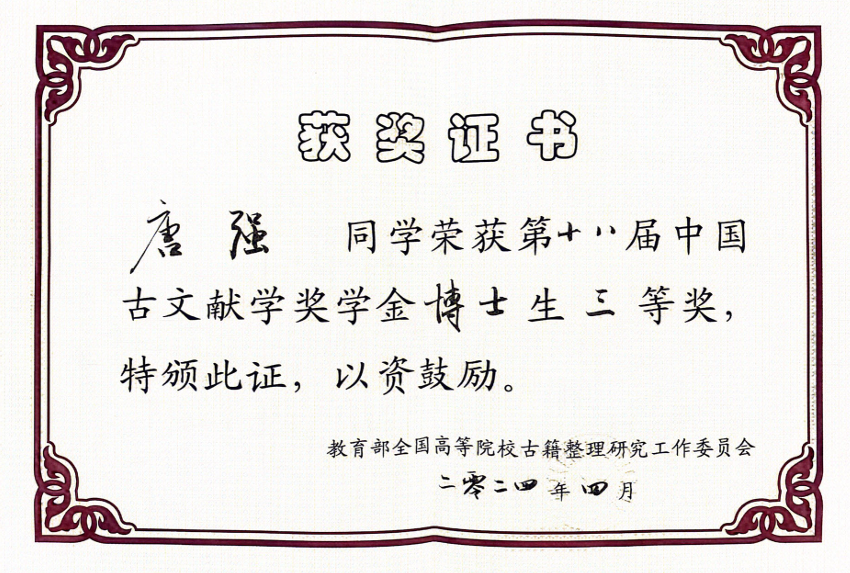 中国古文献学奖学金是国内文献学方面设置的最高奖项,每两年评选一届,每届全国获奖总人数在二十人左右。关于这次获奖,唐强形容自己“很幸运”,并引用齐燕铭先生的集联——“每向空苍追大雅,狂胪文献耗中年”,与大家共勉。