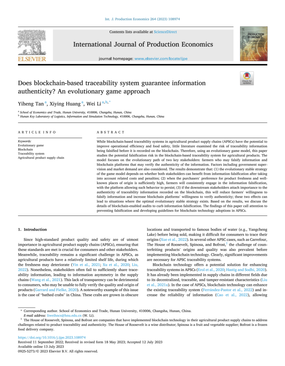 课程作业做启蒙训练。在小学期的通识选修课《可持续供应链创新》上,黄茜瑛与谭益恒合作撰写了题为《Does Blockchain-based Traceability System Guarantee Information Authenticity? An Evolutionary Game Approach》的论文,运用演化博弈的方法探讨了区块链在农产品供应链中的应用,为信息上链过程的风险提出监管建议。