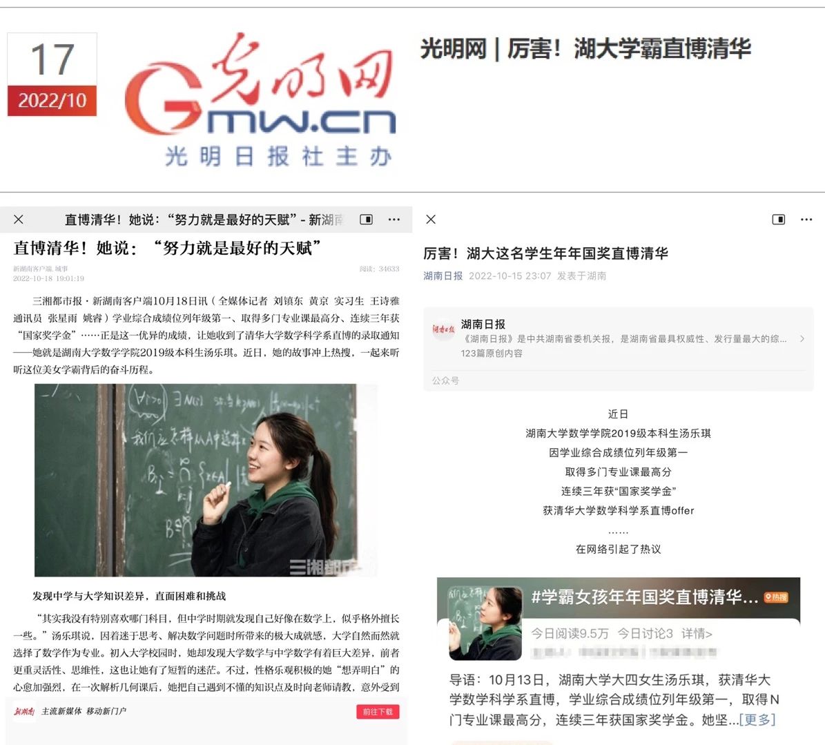 湖南大学党委宣传部(新闻办公室)“优秀毕业生”,连年获一等奖学金、三好学生,考取日语专四专八、N1证书,连续两届获评湖南大学党委宣传部(新闻办公室)“十佳学生记者”,保研至中国人民大学外国语学院......