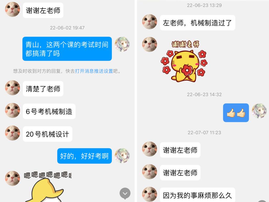 2020年初,在德国交流的机械学院学生赵源因疫情无法回国,只能发微信联系左建平老师选课,但选课时经常出现课堂容量已满,或者两门课程时间冲突的情况,需要时时调整选课方案。“因为两地有时差,白天又需要现场处理其他同学的选课问题,所以我只能和赵源同学约好晚上联系,连续微信好几天,终于沟通处理好了他的选课事宜。”左建平说。