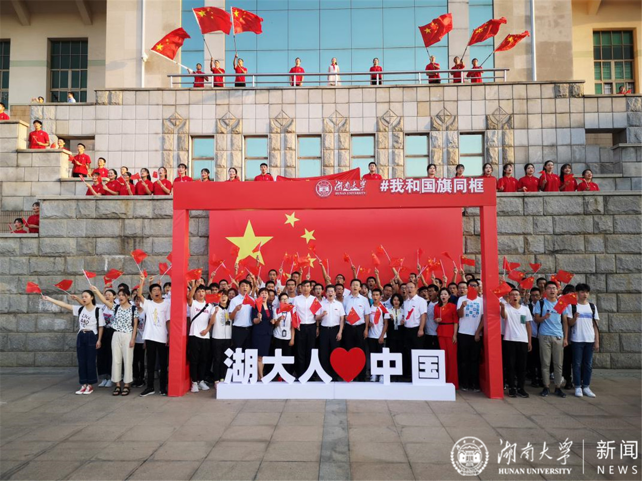 这次庆祝新中国成立七十周年的主题升旗、快闪、合唱活动,刷爆了湖大人的朋友圈,彻底点燃了校园里的爱国爱校情。