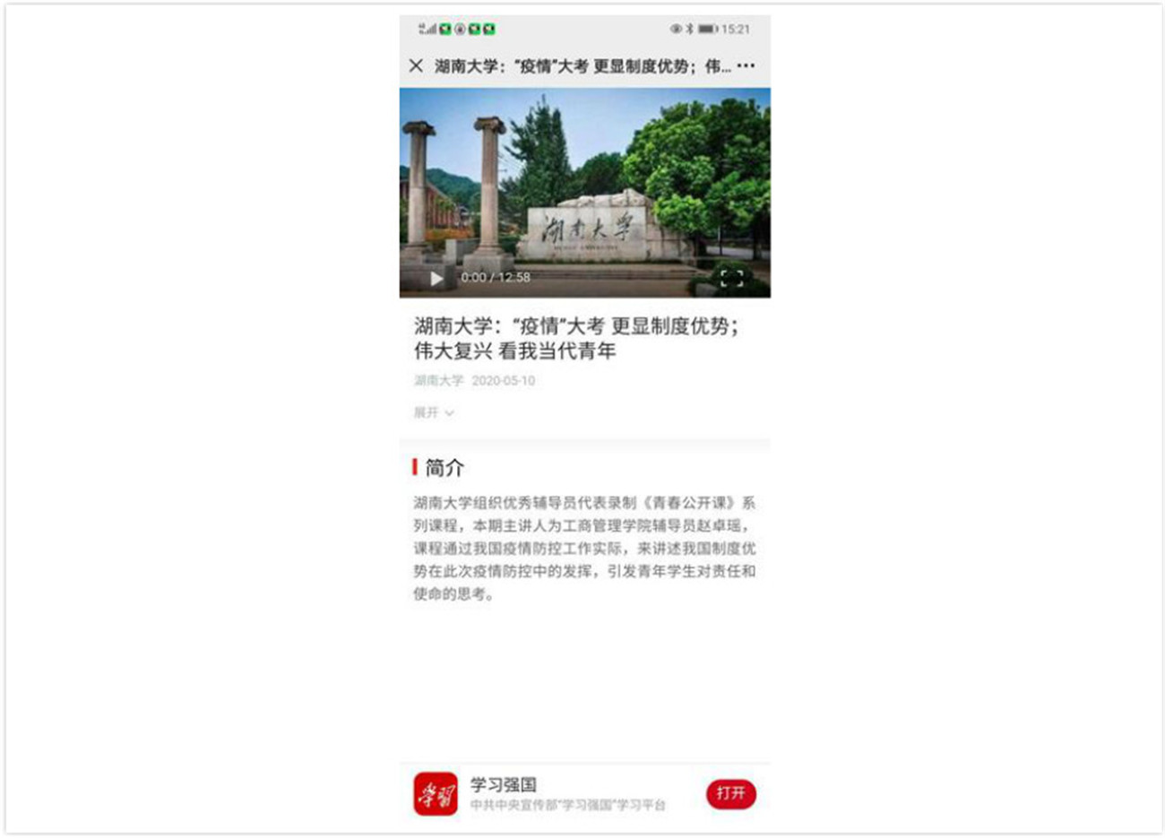 学习强国推介辅导员“青春公开课”。