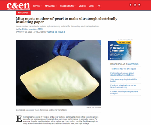 目前,研究成果已申请发明专利。相关研究获全球化学化工领域著名新闻杂志《化学与工程新闻》(Chemical & Engineering News, C&EN)报道(https://cen.acs.org/materials/Mica-meets-motherpearl-make-ultratough/98/i5)。