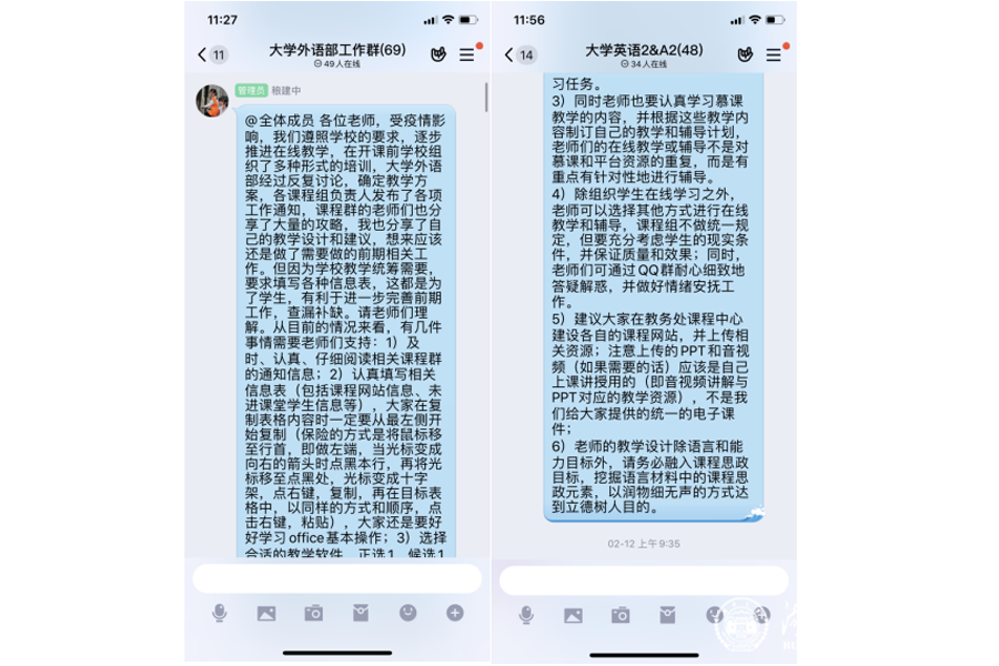 他是同事们的“防控总指挥”。每次给大家传达通知,长篇幅,要点多,却不令人眼花。因为他会将通知内容分类分段,标上序号,结尾处总是反复“谢谢大家、辛苦大家”。当疫情信息满天飞的时候,他第一时间在群里发言:“大家一定要有鉴别力,不要轻信,至少不要传播未经证实的信息,更不能编造和传播谣言。”随即组织大家在线学习相关文件精神。他也是工作群的群主,会“抛砖引玉”分享自己的教学设计,在同事们的反馈中不断完善教学方案,老师们有了“领路人”,不再对线上教学感到迷茫,反而是有了自信和思路。