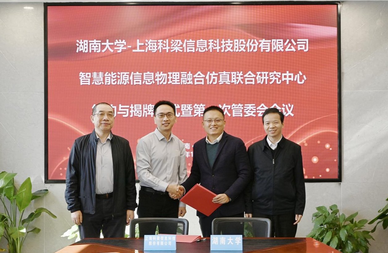11月25日,“湖南大学党委宣传部(新闻办公室)-上海科梁信息科技股份有限公司智慧能源信息物理融合仿真联合研究中心”签约暨揭牌仪式举行。副校长李肯立、上海科梁信息科技股份有限公司总经理桑苏明为联合研究中心揭牌并见证签约,电气与信息工程学院院长帅智康、科梁公司副总经理李鸿彪代表双方签署合作协议。该研究中心将聚焦新型电力系统稳定性与电网数智化关键技术,开展理论研究和科研攻关,推动智能算力与能源电力协同发展,助力我国能源电力行业...