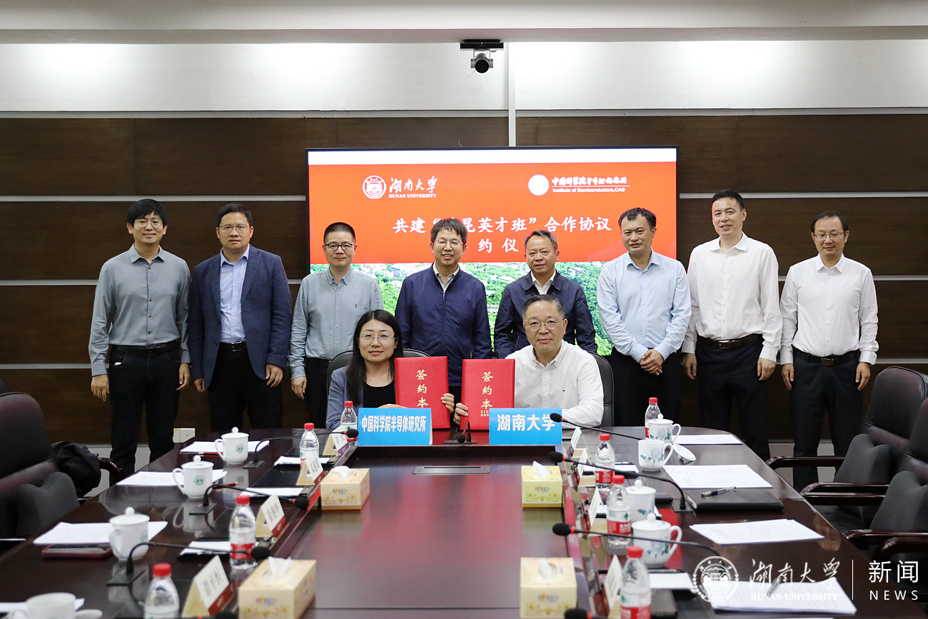 4月27日,湖南大学党委宣传部(新闻办公室)与中国科学院半导体研究所共建“黄昆英才班”合作协议签约仪式在校办公楼二会议室举行。校长段献忠,中国科学院半导体研究所所长谭平恒出席并见证签约,校长助理许和连与中国科学院半导体研究所人事教育处处长徐艳坤代表双方签署合作协议。签约仪式上,双方围绕“黄昆英才班”育人体系建设、拔尖人才培养方案及配套保障措施展开深入探讨。双方表示,将以此次共建合作签约为契机,深化科教融合创新模式、共育产...