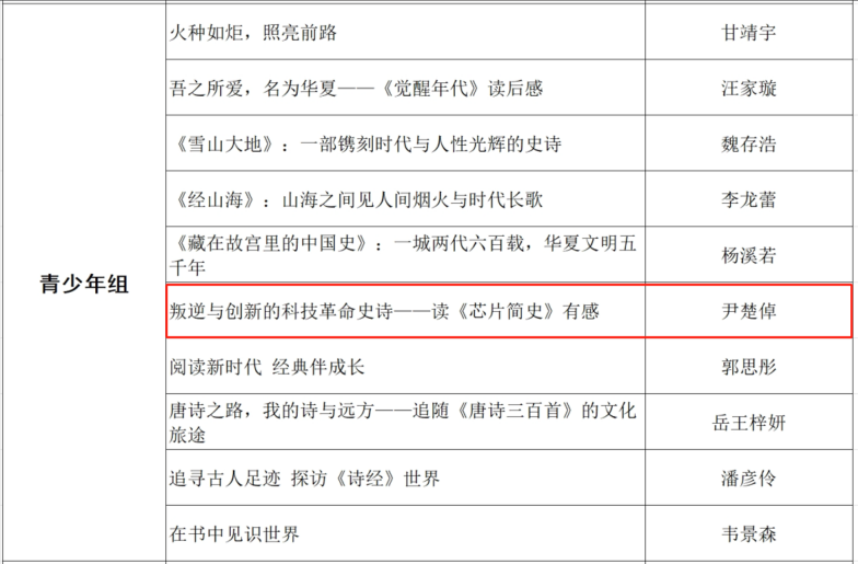 近日,“书香满中国”全国征文大赛结果揭晓,土木院2024级本科生尹楚倬同学以《芯片简史》为切入点,从科技史视角剖析创新精神,凭借作品《叛逆与创新的科技革命史感——读〈芯片简史〉有感》获全国二等奖。大赛由中宣部指导,面向全国高校征集优秀读书作品,旨在弘扬新时代青年的人文与科学素养。本届大赛共收到稿件超10万篇,最终评选出一等奖17篇,二等奖33篇、三等奖55篇和优秀奖若干篇。来源:土木院通讯员:邓韬责任编辑...