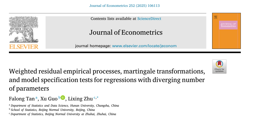 近日,金融与统计学院谭发龙教授在高维统计领域取得研究进展,研究成果以“Weighted residual empirical processes, martingale transformations,and model specification tests for regressions with diverging numberof parameters”为题在计量经济学国际期刊Journal of Econometrics在线发表。模型设定检验问题是统计学和计量经济学中基本问题之一。尽管现有文献中已有对该问题的大量研究,但在维数发散时的高维模型设定检验...