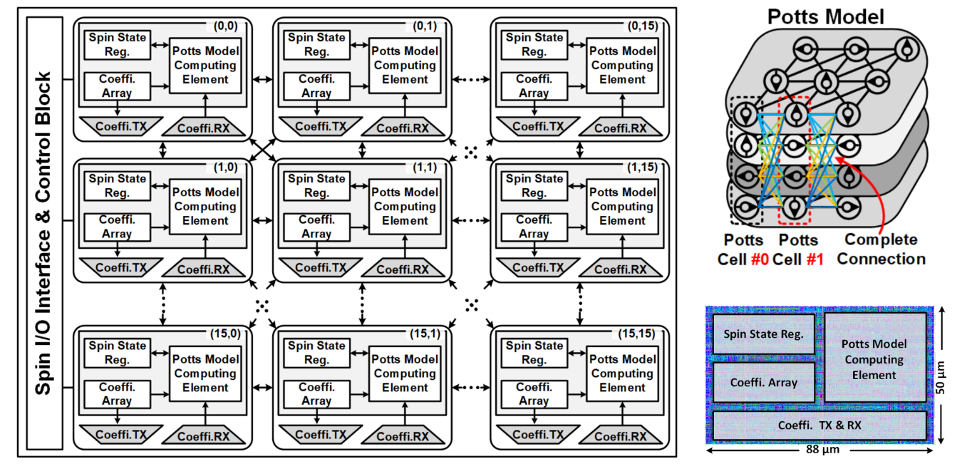 多态组合优化问题广泛存在于路径规划、生物制药、图像处理等众多领域,其状态数量多变、物理意义丰富,对处理器的计算能力提出了远高于传统二态问题的要求。然而,现有组合优化处理器大多仅能处理两个状态的简单问题,在应对多态场景时普遍面临求解速度慢、硬件面积大、能效低等瓶颈。为攻克这一难题,我校半导体学院陈卓俊教授团队成功研发出面向复杂组合优化问题的全集成波茨机处理器芯片。该芯片基于65nm CMOS工艺制造,集成...