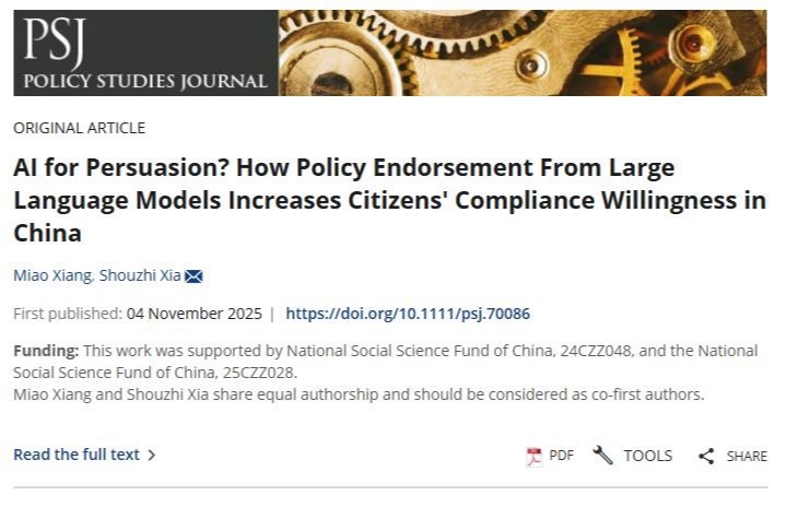 近日,我校公共管理学院助理教授夏守智研究成果《说服性人工智能?大语言模型的政策背书如何提升公众的政策遵从意愿》在国际期刊《Policy Studies Journal》发表。公众的自愿遵从对于公共政策的顺利实施与预期效果的取得至关重要。在政策传播中,政府机构常常依赖专家背书提升公众的支持度。但许多研究表明,专家的可信度在全球范围内出现不同程度的下降。本研究探讨大语言模型是否能够为公共政策背书,进而影响公众的政策遵从...