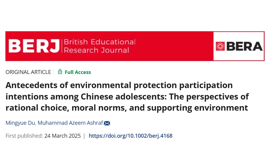 近日,教育科学研究院ASHRAF MUHAMMAD AZEEM副教授在教育学研究领域中取得新进展,研究成果以《Antecedents of environmental protection participation intentions among Chinese adolescents: The perspectives of rational choice, moral norms, and supporting environment》为题,发表于教育学国际期刊《British Educational Research Journal》。人类活动引发的环境问题正对全人类的健康与福祉构成威胁,环境教育是应对和...