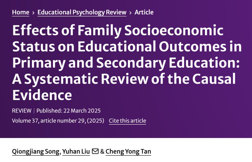 近日,教科院宋琼将老师与香港大学教育学院研究团队在教育平等政策研究领域取得进展。研究成果以《Effects of Family Socioeconomic Status on Educational Outcomes in Primary and Secondary Education: A Systematic Review of the Causal Evidence》为题,发表于教育心理学领域国际顶级期刊《Educational Psychology Review》。近半个世纪以来,教育研究领域围绕家庭社会经济地位(SES)对学生教育成果的影响形成了两种截然...