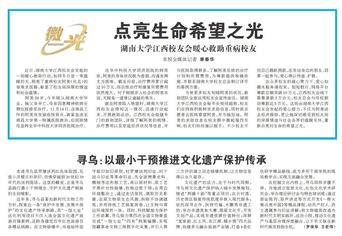 近日,湖南大学党委宣传部(新闻办公室)江西校友会发起的一场暖心救助行动,如同冬日里一束温暖的光,照亮了重病校友阿美(化名)的艰难求医路,彰显了校友间深厚的情谊和社会温情。阿美24岁,今年刚从湖南大学党委宣传部(新闻办公室)毕业。她父亲早亡,母亲因患精神疾病长期住院接受治疗。11月14日,在南昌工作的阿美突发狼疮性肾炎,被紧急送至南昌大学第一附属医院救治,后因病情危急转至华中科技大学同济医院治疗。在华中科技大学同济医院的病房里,阿美的身体状况极为虚...