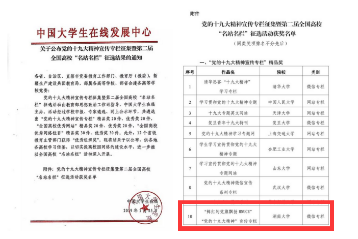 近日,由教育部思想政治工作司指导,中国大学生在线主办的党的十九大精神宣传专栏征集暨第二届全国高校“名站名栏”征选活动顺利结束,本次活动共遴选出“党的十九大精神宣传专栏”精品奖20件、优秀奖20件,“全国高...