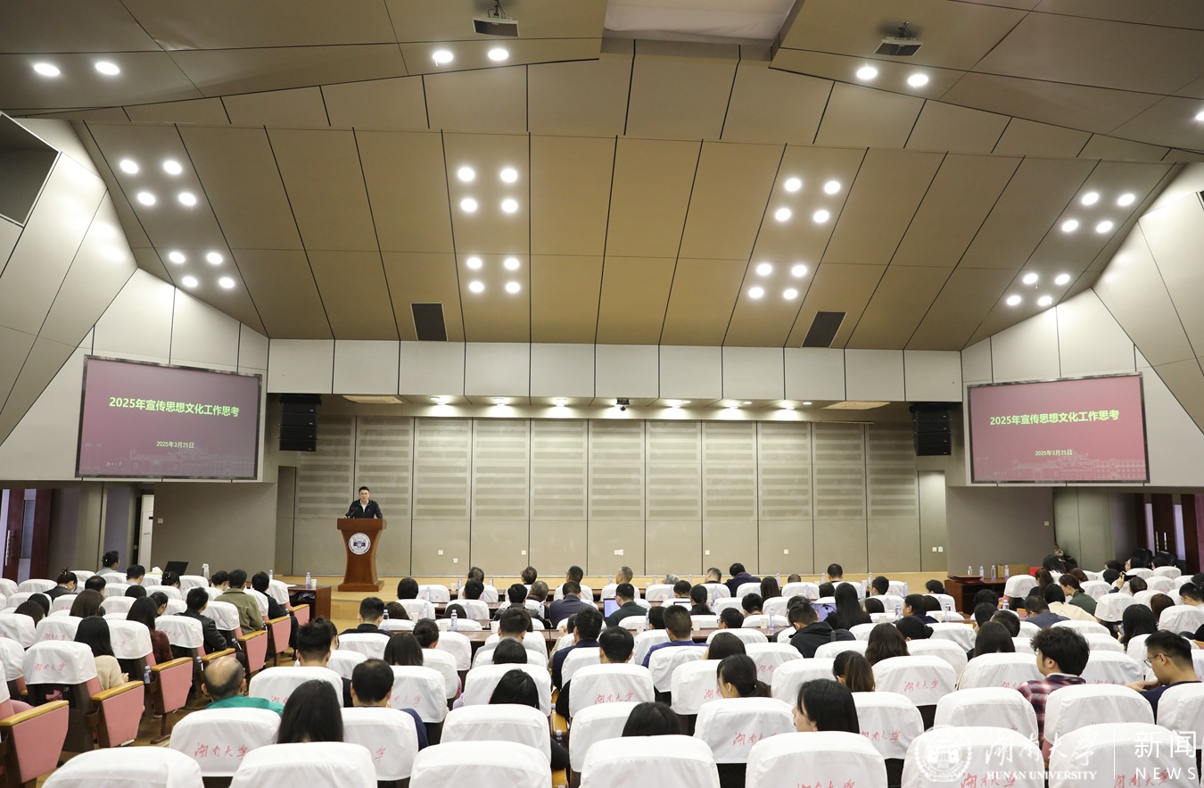 3月25日,湖南大学党委宣传部(新闻办公室)2025年宣传思想文化工作会议在逸夫楼报告厅举行。校党委副书记唐珍名出席并讲话。唐珍名指出,做好2025年宣传思想文化工作,要重点把握好“怎么看”和“怎么干”两个方向。“怎么看”宣传思想文化工作,可以概括为“极端重要、大有可为”。意识形态工作是党的一项极端重要的工作,面对新阶段、新任务、新要求、新期待,宣传思想工作大有可为。“怎么干”宣传思想文化工作,就是要讲好故事、讲好道理。要讲清楚...