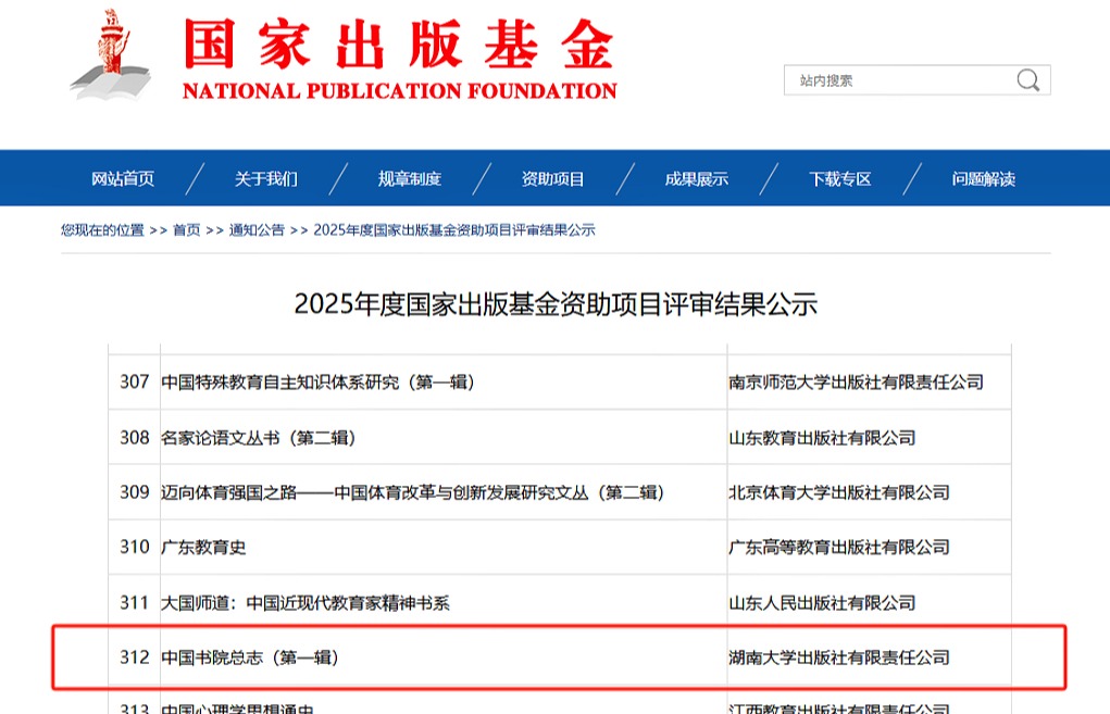近日,国家出版基金规划管理办公室公布了“2025年度国家出版基金资助项目评审结果”,我校出版社《中国书院总志(第一辑)》《量子纠缠源的时间同步技术》2个项目入选国家出版基金资助项目名单。《中国书院总志(第一辑)》是国家社科基金重大项目“中国书院文献整理与研究”的阶段性研究成果,已入选“十四五”国家重点出版物出版规划项目。第一辑包括湖南卷(上、下)和山西卷,以清代的行政区划为标准,按省、府、州、县书院...