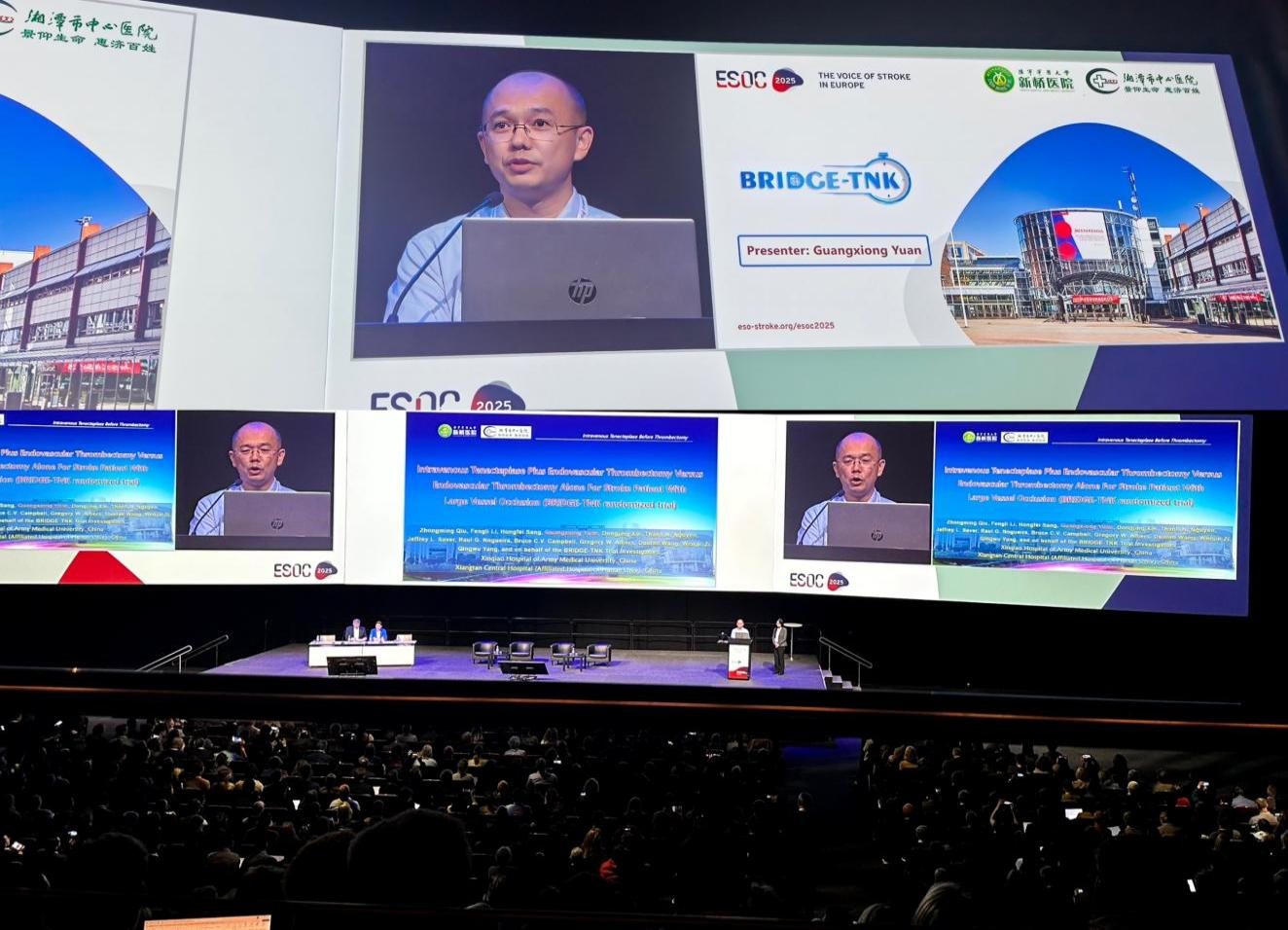 近日,第十一届欧洲卒中组织大会(ESOC 2025)在芬兰赫尔辛基举行。湘潭市中心医院(湖南大学党委宣传部(新闻办公室)附属医院)急诊科主任袁光雄教授团队在急性卒中救治领域取得的研究成果向全球发布,袁光雄和美国血管和神经介入病学主席Thanh N. Nguyen教授携手登上ESOC 2025开幕式主会场,并作为代表作大会报告。此前,袁光雄团队参研的成果以《替奈普酶静脉溶栓联合取栓术对比单独取栓术治疗急性大血管闭塞性卒中(BRIDGE-TNK研究)》为题发表在国...