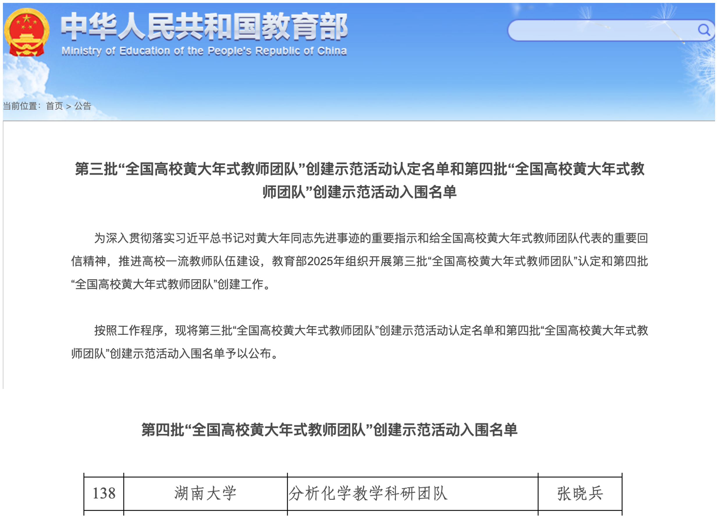 近日,教育部公布了第四批“全国高校黄大年式教师团队”入围名单,张晓兵教授领衔的分析化学教学科研团队成功入选。这是我校教师团队连续第四次入选“全国高校黄大年式教师团队”名单。张晓兵教授带领团队面向“健康中国”重大战略需求和世界科技前沿,聚焦化学生物传感领域关键科学问题和卡脖子核心技术的集成攻关与应用基础研究,重点开展功能核酸生物传感、分子成像探针与试剂、化学生物传感系统集成与仪器的研究工作,着力...